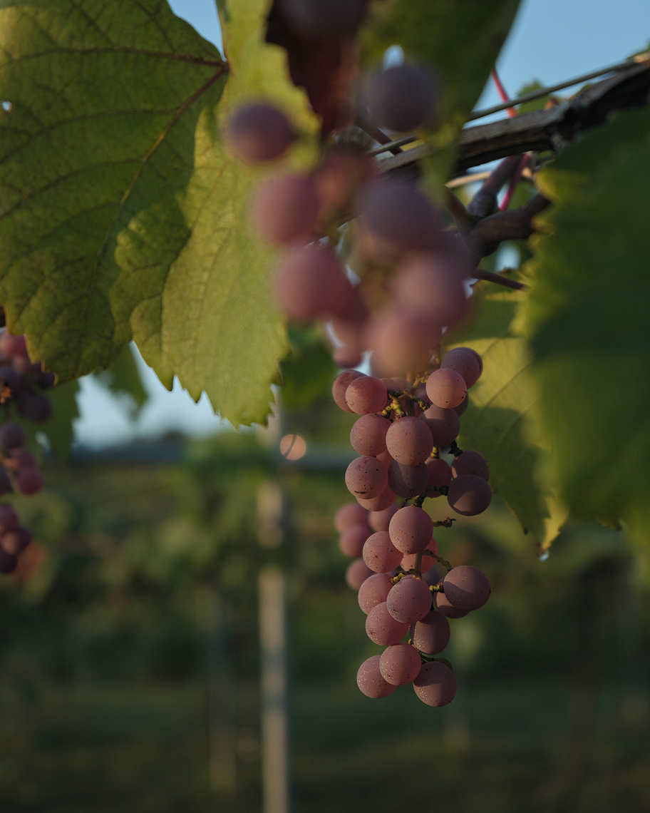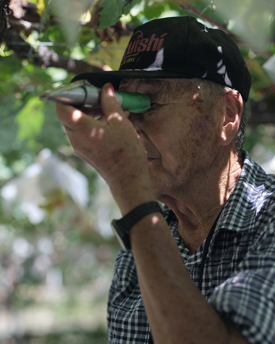 降り注ぐ太陽の照り返しを受けて、下から色づいていくブドウ。力強く根を張る幹から豊かに広がる葉を間引きし、“美しい木漏れ陽”をつくることで、甲斐路は次第に彩りを深めていきます。