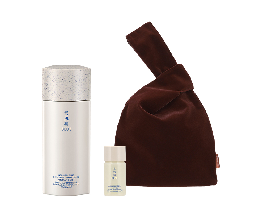 「雪肌精 BLUE」から2025年12月に新たに登場するアロマミスト(現品)に、同じく12月に発売となるボディオイルのミニサイズ、雪肌精 BLUE オリジナルのバッグがセットになったホリデー期間限定のスペシャルキットが登場。天然の精油を配合したスパイシーハーバルウッディの香りが叶えるメディテーションの時間をお届けします。
