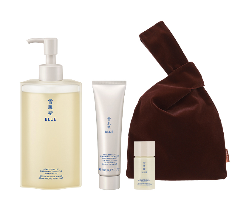 「雪肌精 BLUE」から2025年12月に新たに登場するハンドウォッシュ(現品)と、ハンド&ボディミルク(現品)に同じく12月に発売となるボディオイルのミニサイズ、雪肌精 BLUE オリジナルのバッグがセットになったホリデー期間限定のスペシャルキットが登場。