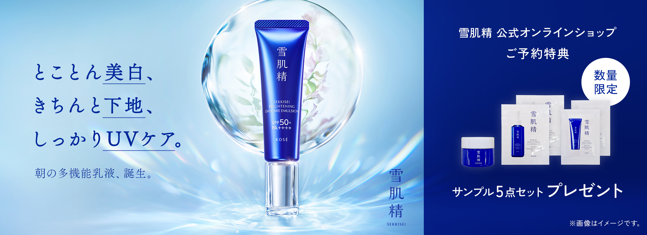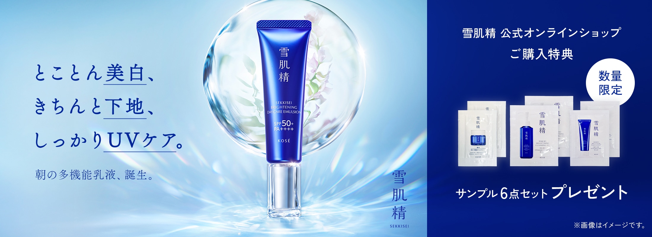 数量限定キットは本品のみの価格と同価格、14mLの薬用美白化粧水ミニサイズつき。SPF50+/PA++++