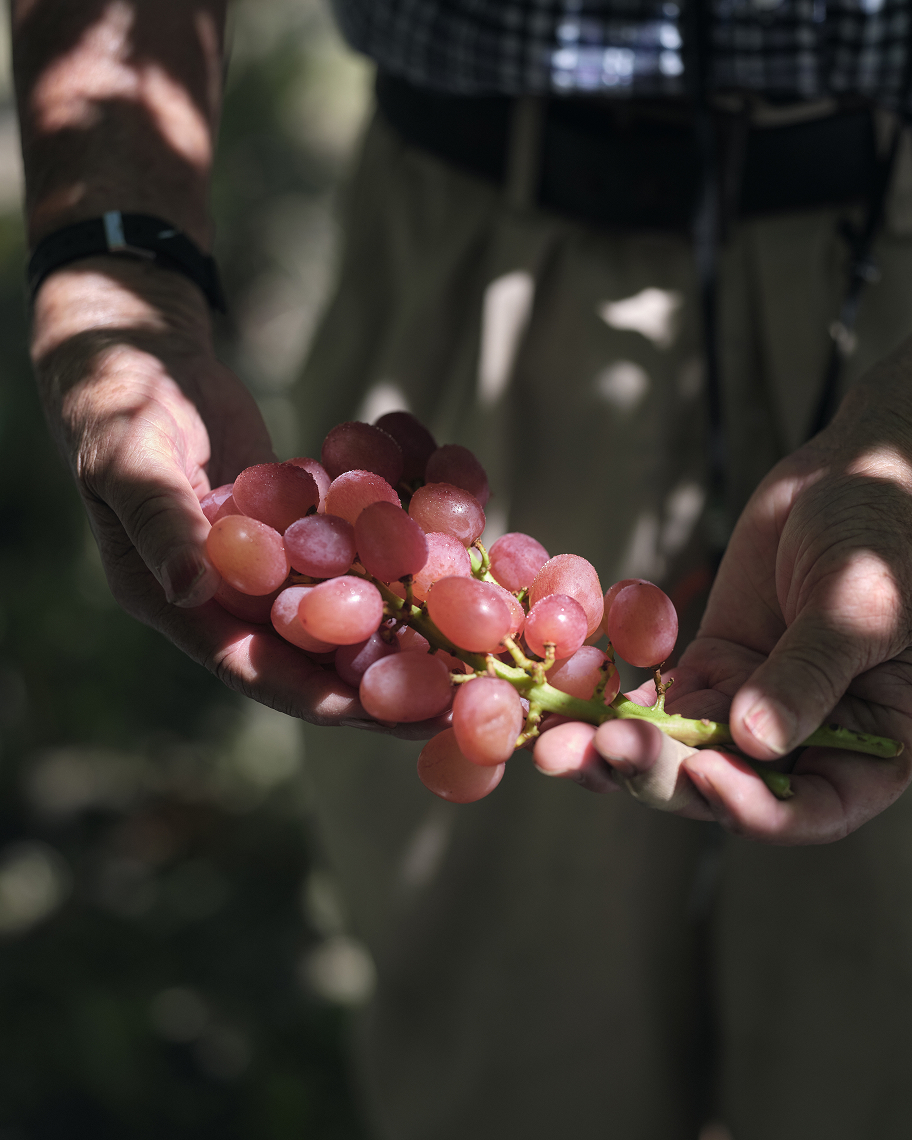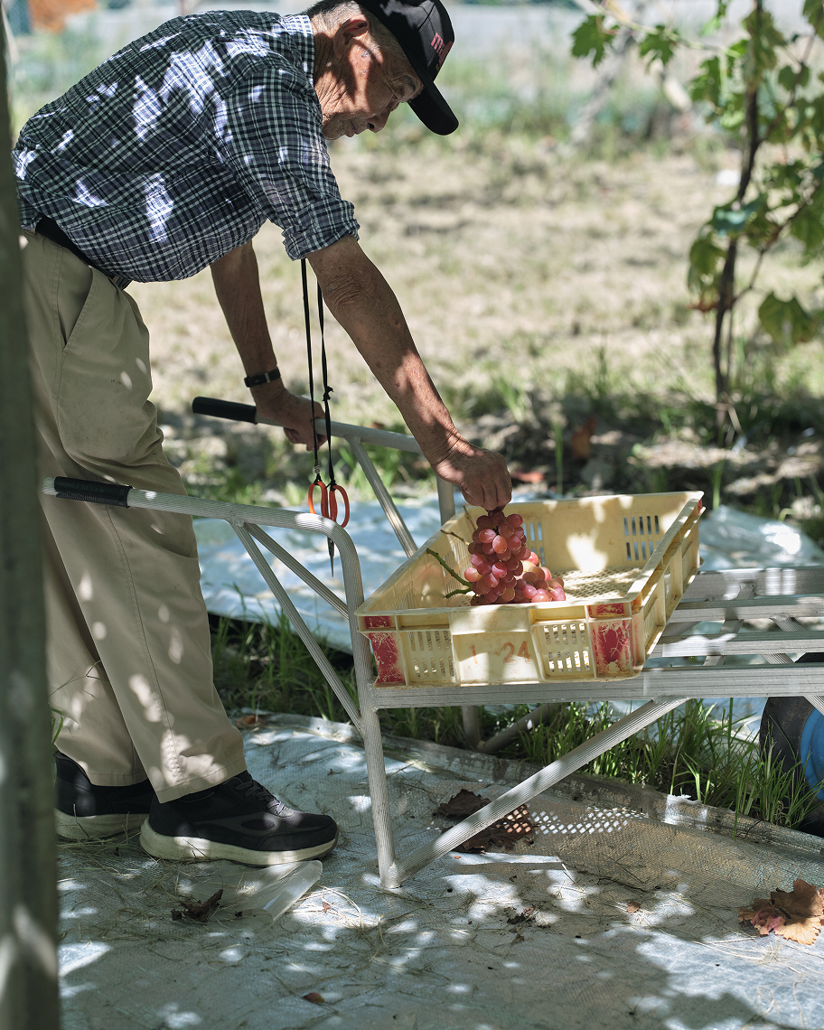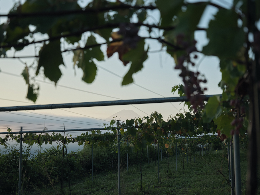 降り注ぐ太陽の照り返しを受けて、下から色づいていくブドウ。力強く根を張る幹から豊かに広がる葉を間引きし、“美しい木漏れ陽”をつくることで、甲斐路は次第に彩りを深めていきます。